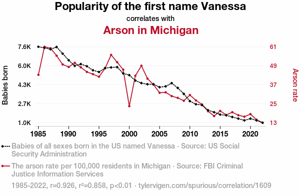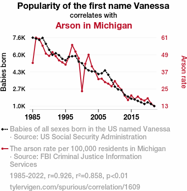 - The spurious research paper: Playing with Fire: Exploring the Incendiary Relationship Between the Popularity of the Name Vanessa and Arson in Michigan