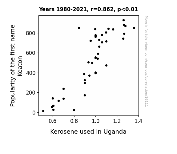 This means 74.3% of the change in the one variable (i.e., Kerosene used in Uganda) is predictable based on the change in the other (i.e., Popularity of the first name Keaton) over the 42 years from 1980 through 2021.