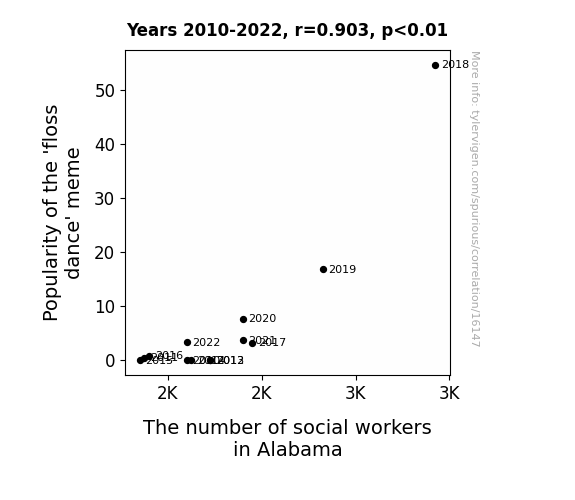 This means 81.5% of the change in the one variable (i.e., The number of social workers in Alabama) is predictable based on the change in the other (i.e., Popularity of the 'floss dance' meme) over the 13 years from 2010 through 2022.