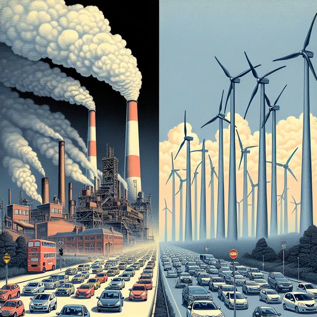 Prompt: Visual Prompt: Generate an image in the style of a Discovery magazine cover, depicting Terre Haute, Indiana with smog hovering over the city due to cars and factories, contrasted with wind turbines in the United Kingdom gracefully turning against a cloudy sky. Emphasize the stark difference in air quality and environmental impact through contrasting visuals of pollution and renewable energy. The depiction should include only scenes, people, and objects, it should not include text or speech bubbles.