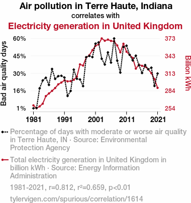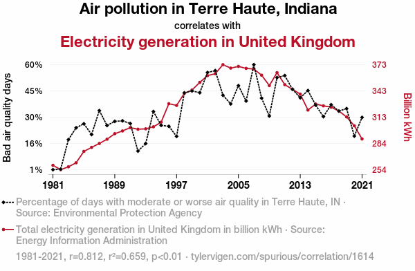 This means 65.9% of the change in the one variable (i.e., Electricity generation in United Kingdom) is predictable based on the change in the other (i.e., Air pollution in Terre Haute, Indiana) over the 41 years from 1981 through 2021.