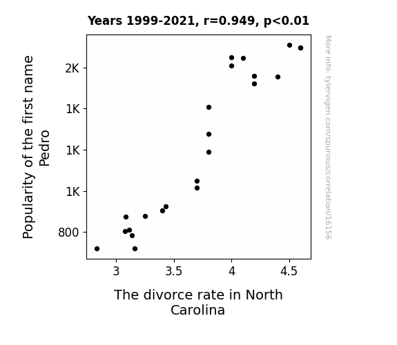This means 90.1% of the change in the one variable (i.e., The divorce rate in North Carolina) is predictable based on the change in the other (i.e., Popularity of the first name Pedro) over the 23 years from 1999 through 2021.