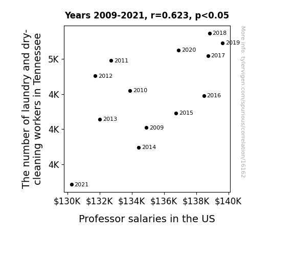 This means 38.8% of the change in the one variable (i.e., Professor salaries in the US) is predictable based on the change in the other (i.e., The number of laundry and dry-cleaning workers in Tennessee) over the 13 years from 2009 through 2021.