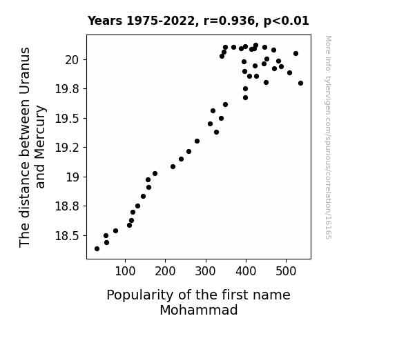 This means 87.7% of the change in the one variable (i.e., Popularity of the first name Mohammad) is predictable based on the change in the other (i.e., The distance between Uranus and Mercury) over the 48 years from 1975 through 2022.