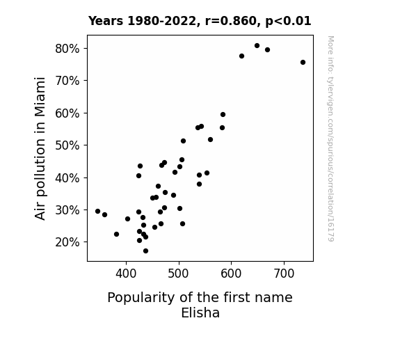 This means 74% of the change in the one variable (i.e., Popularity of the first name Elisha) is predictable based on the change in the other (i.e., Air pollution in Miami) over the 43 years from 1980 through 2022.