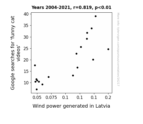 This means 67.1% of the change in the one variable (i.e., Wind power generated in Latvia) is predictable based on the change in the other (i.e., Google searches for 'funny cat videos') over the 18 years from 2004 through 2021.