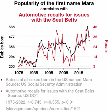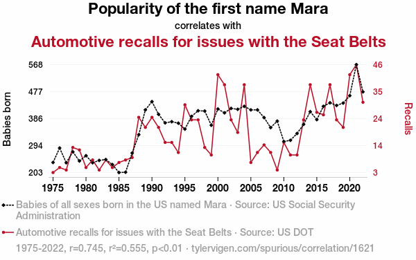 This means 55.5% of the change in the one variable (i.e., Automotive recalls for issues with the Seat Belts) is predictable based on the change in the other (i.e., Popularity of the first name Mara) over the 48 years from 1975 through 2022.