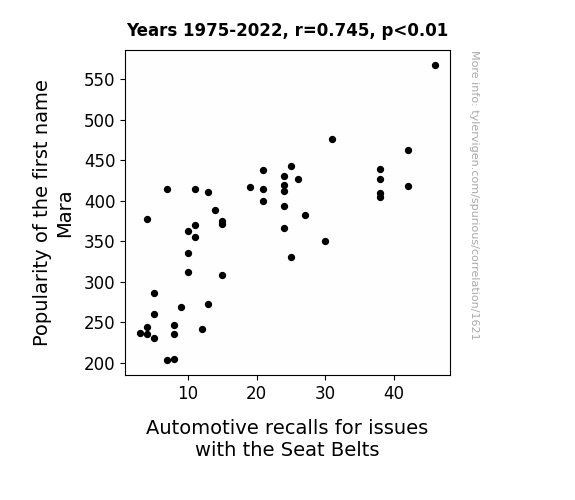 To commence our investigative odyssey into the intriguing relationship between the prevalence of the name "Mara" and automotive recalls concerning seat belt issues, we embarked on a quest for data spanning the years 1975 to 2022. Our research team navigated the virtual realm, collecting a treasure trove of data from the venerable repositories of the US Social Security Administration and the enigmatic sanctum of the US Department of Transportation. The expanse of our dataset encompassed the varying fortunes of the name "Mara" and the convoluted chronicles of automotive recalls, particularly those entwined with seat belt maladies.