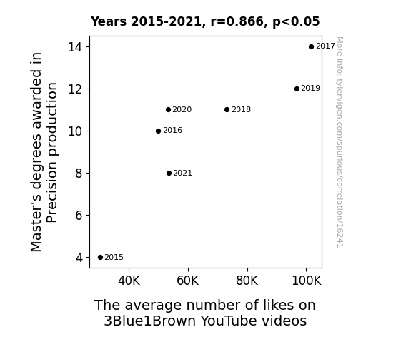 This means 75.1% of the change in the one variable (i.e., The average number of likes on 3Blue1Brown YouTube videos) is predictable based on the change in the other (i.e., Master's degrees awarded in Precision production) over the 7 years from 2015 through 2021.