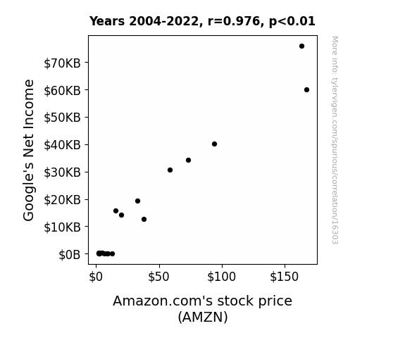 This means 95.2% of the change in the one variable (i.e., Amazon.com's stock price (AMZN)) is predictable based on the change in the other (i.e., Google's Net Income) over the 19 years from 2004 through 2022.