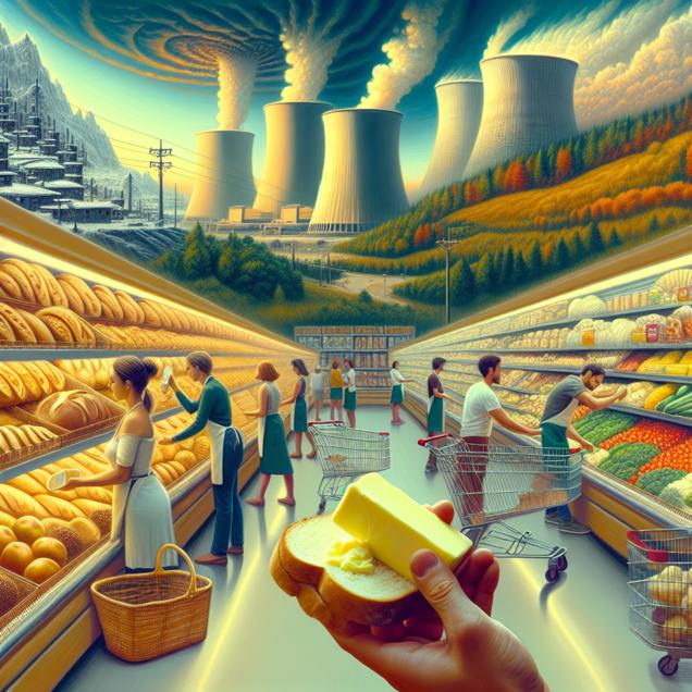 ChatGPT: In a grocery store, people are spreading creamy butter on their bread as they shop. Meanwhile, in the background, countries around the world are seen shutting down their permanent nuclear reactors, as the energy transition to cleaner sources gains momentum.