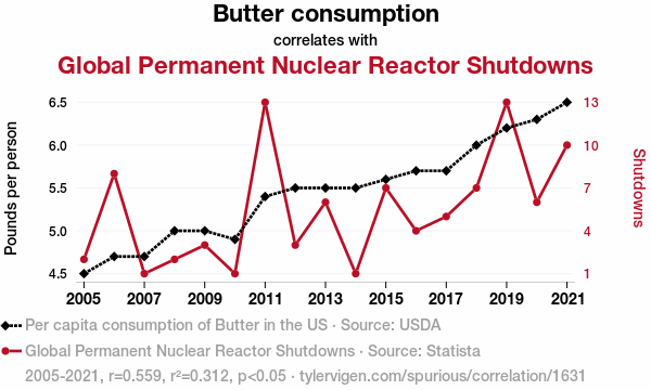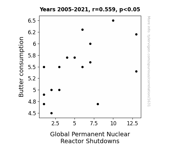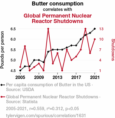 - The spurious research paper: Spread Thin: The Curious Connection Between Butter Consumption and Global Permanent Nuclear Reactor Shutdowns