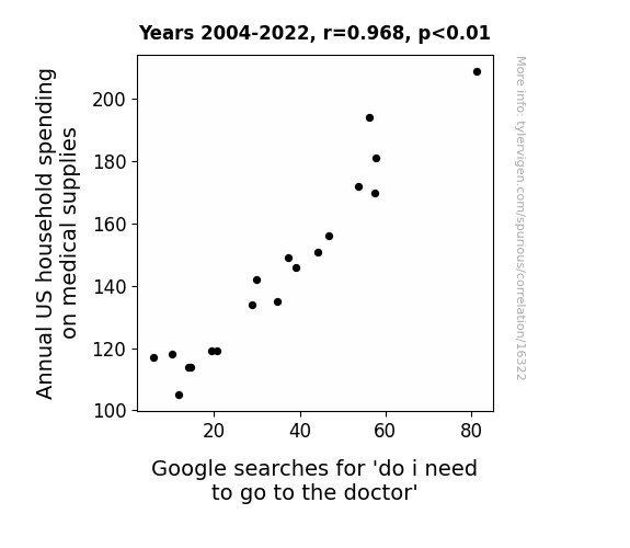 This means 93.8% of the change in the one variable (i.e., Google searches for 'do i need to go to the doctor') is predictable based on the change in the other (i.e., Annual US household spending on medical supplies) over the 19 years from 2004 through 2022.