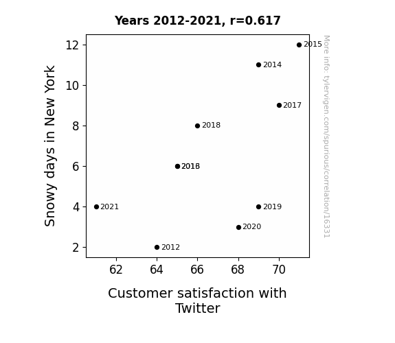 This means 38% of the change in the one variable (i.e., Customer satisfaction with Twitter) is predictable based on the change in the other (i.e., Snowy days in New York) over the 10 years from 2012 through 2021.