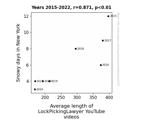 This means 75.9% of the change in the one variable (i.e., Average length of LockPickingLawyer YouTube videos) is predictable based on the change in the other (i.e., Snowy days in New York) over the 8 years from 2015 through 2022.