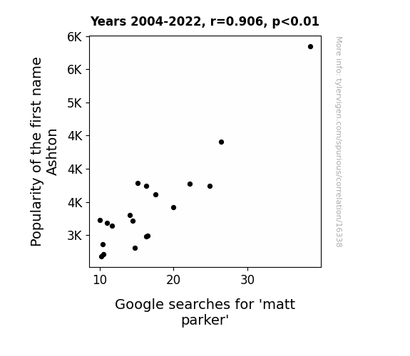 This means 82.1% of the change in the one variable (i.e., Google searches for 'matt parker') is predictable based on the change in the other (i.e., Popularity of the first name Ashton) over the 19 years from 2004 through 2022.