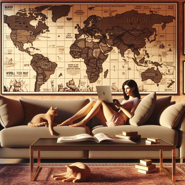 Prompt: Generate an image of a cozy living room with a person sitting on a comfortable couch. Surround them with xkcd comics about maps plastered on the walls. On the coffee table, place a laptop open to a Google search for "my cat scratched me." The person should be engrossed in the comics, with their pet cat lounging nearby. Capture a relaxed and comforting atmosphere in the room. The depiction should include only scenes, people, and objects, it should not include text or speech bubbles.