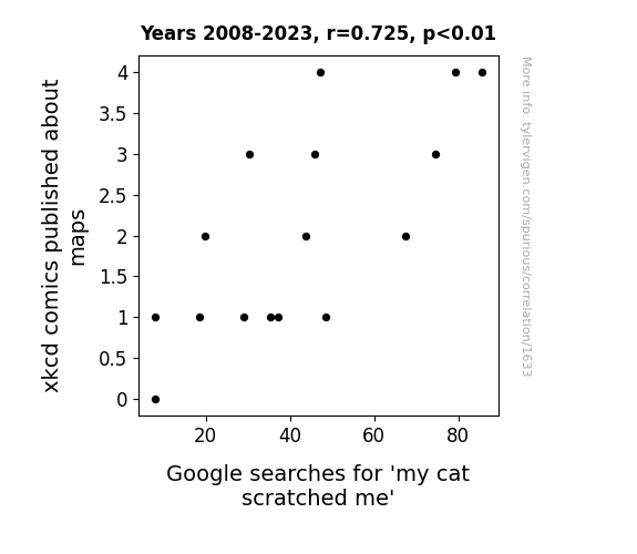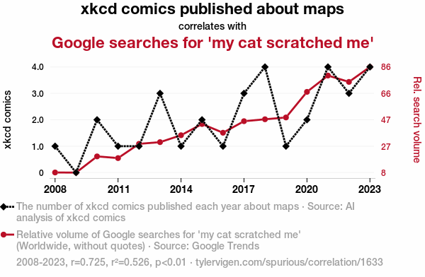 This means 52.6% of the change in the one variable (i.e., Google searches for 'my cat scratched me') is predictable based on the change in the other (i.e., xkcd comics published about maps) over the 16 years from 2008 through 2023.