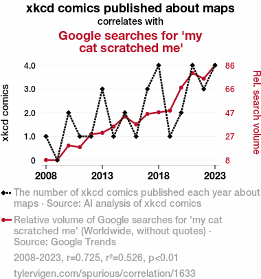User prompt: Please make up a funny explanation for how an increase in xkcd comics published about maps caused my cat scratched me (Google searches for 'my cat scratched me') to increase.