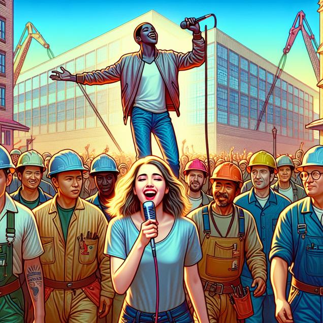 ChatGPT: A young American Idol winner excitedly walks through a bustling Alaskan town, passing by a group of experienced millwrights working on a new construction project. Their ages vary, but the winner's youthful energy adds a vibrant contrast to the seasoned expertise of the millwrights.