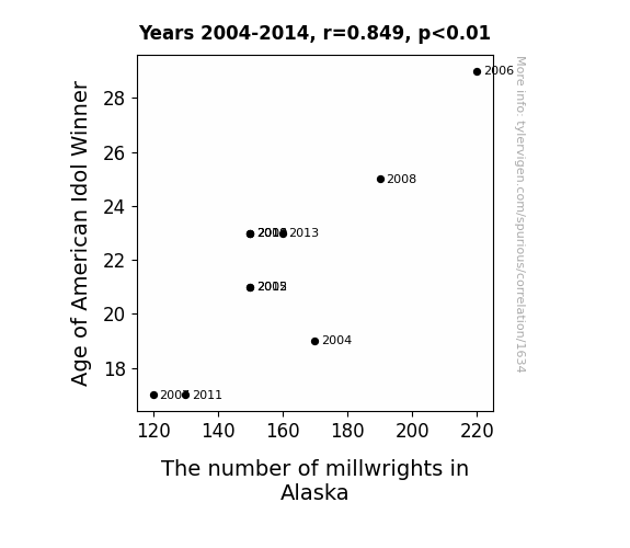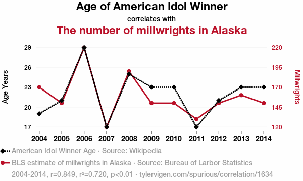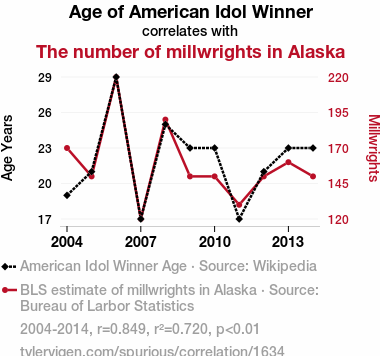 - The spurious research paper: Aging Idols and Alaskan Artisans: Exploring the Curious Relationship Between American Idol Winners' Age and the Millwright Population in The Last Frontier