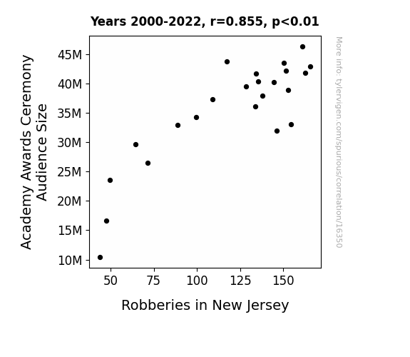 This means 73.1% of the change in the one variable (i.e., Robberies in New Jersey) is predictable based on the change in the other (i.e., Academy Awards Ceremony Audience Size) over the 23 years from 2000 through 2022.