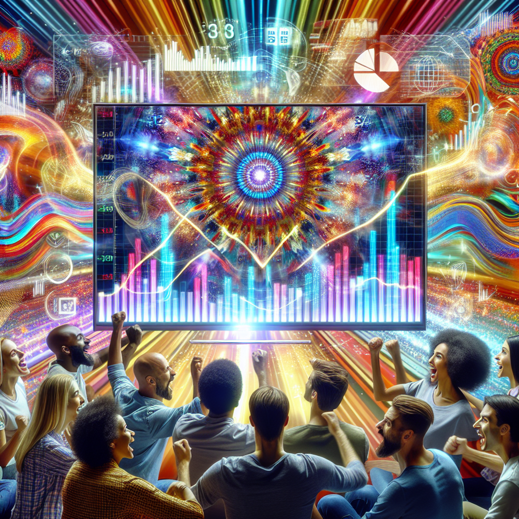 Prompt: Generate an image of a group of people gathered around a vibrant, pulsating TV screen, their faces reflecting the kaleidoscopic colors and patterns emanating from the display. They exude an aura of excitement and enthusiasm as they fervently discuss the latest hit series, "Maeve's Mystery," that plays on the screen. Behind them, the stock ticker glows with energy, displaying the Netflix stock price rising steadily amidst a backdrop of swirling, psychedelic patterns. The depiction should include only scenes, people, and objects, it should not include text or speech bubbles.