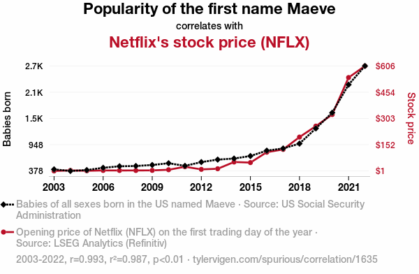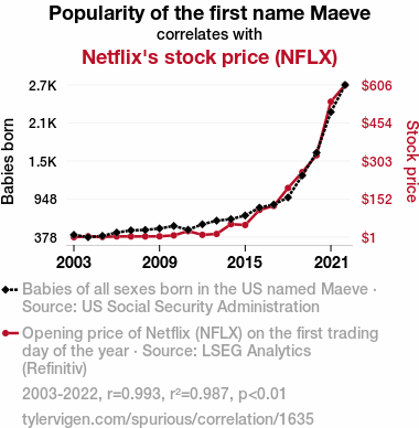 A linear line chart with years as the X-axis and two variables on the Y-axis. The first variable is Popularity of the first name Maeve and the second variable is Netflix's stock price (NFLX).  The chart goes from 2003 to 2022, and the two variables track closely in value over that time. Small Image