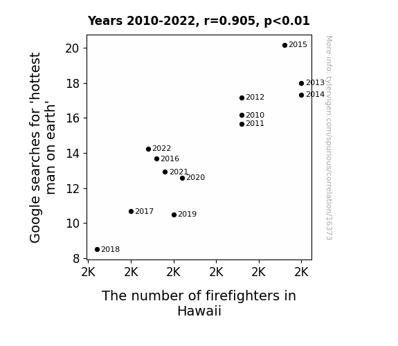 This means 81.9% of the change in the one variable (i.e., The number of firefighters in Hawaii) is predictable based on the change in the other (i.e., Google searches for 'hottest man on earth') over the 13 years from 2010 through 2022.