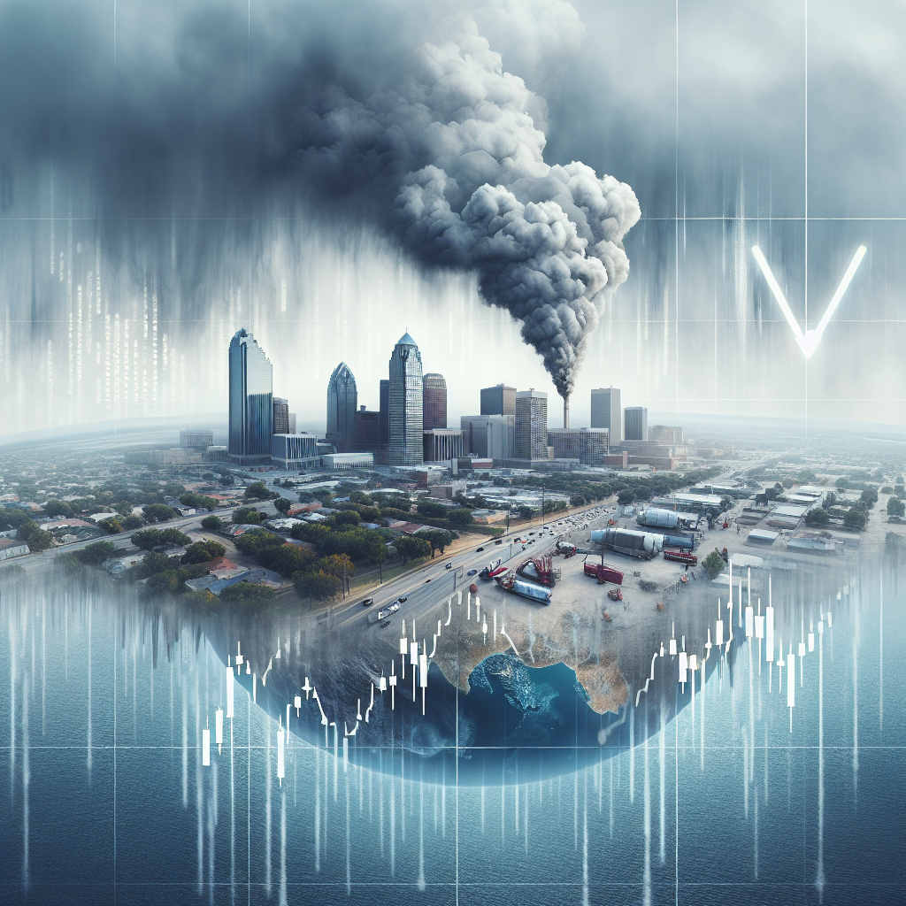 ChatGPT: In Amarillo, Texas, the sky appears hazy with a noticeable thin layer of smog, and a slight smell of pollution in the air. Meanwhile, on the stock ticker, Canadian Natural Resources' stock price is shown with a downward trend, indicating a slight decline.