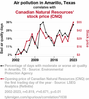 This means 67.1% of the change in the one variable (i.e., Canadian Natural Resources' stock price (CNQ)) is predictable based on the change in the other (i.e., Air pollution in Amarillo, Texas) over the 22 years from 2002 through 2023.