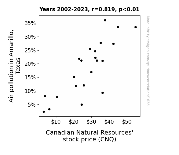 Our analysis revealed a strong positive correlation between air pollution levels in Amarillo, Texas, and the stock price of Canadian Natural Resources (CNQ). The correlation coefficient of 0.8191433 indicates a robust positive relationship between these seemingly disparate variables. It's as if the winds of the stock market are carrying the scent of Amarillo's pollution, influencing CNQ's stock price in unseen ways.