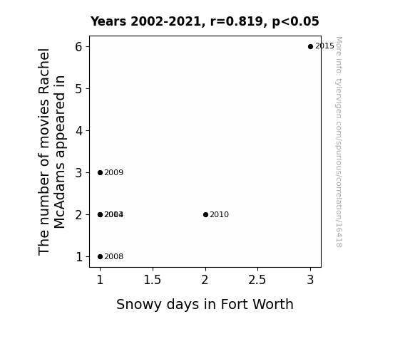 This means 67.1% of the change in the one variable (i.e., Snowy days in Fort Worth) is predictable based on the change in the other (i.e., The number of movies Rachel McAdams appeared in) over the 6 years from 2002 through 2021.
