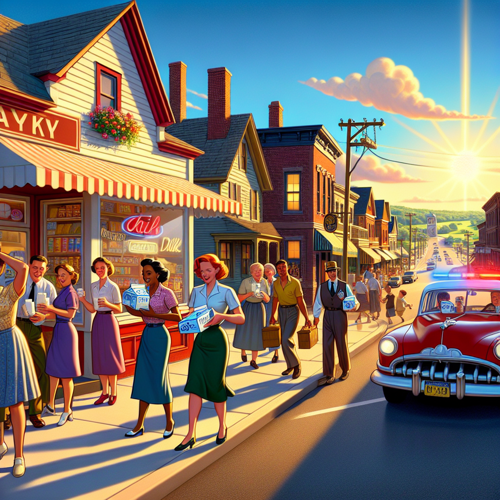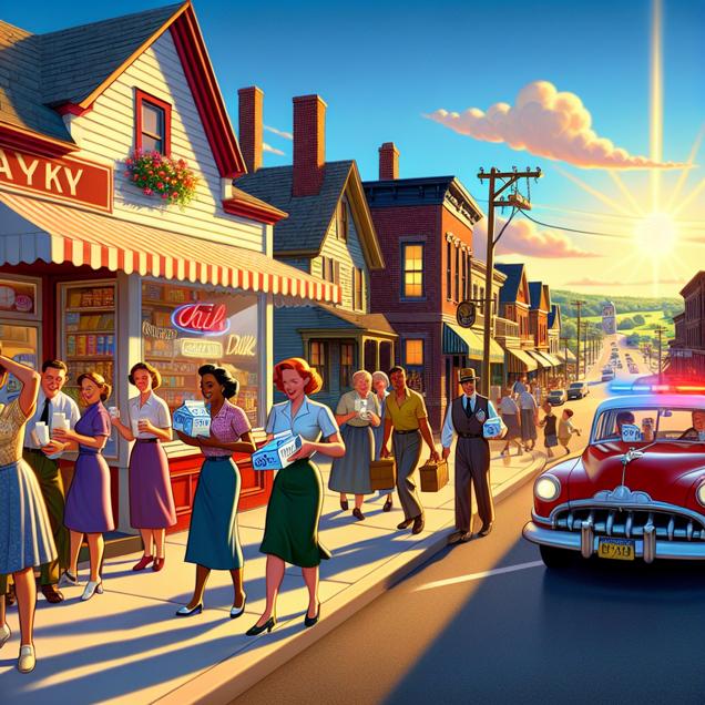 Prompt: An image that looks like it is a scene from a Pixar movie, depicting a bustling Pennsylvania town where a group of people gather at a local convenience store, purchasing cartons of milk. In the background, a police car speeds by, responding to a reported robbery at a nearby bank. The sky is clear and the sun is shining, casting warm golden rays over the charming small town. The store's exterior features a classic red and white facade, with colorful flowers in window boxes. The people are depicted with diverse expressions and unique character designs, each carrying their own carton of milk. The police car is brightly colored with flashing lights and the town's iconic landmarks can be seen in the distance, giving a sense of community and familiarity. The depiction should include only scenes, people, and objects, it should not include text or speech bubbles.