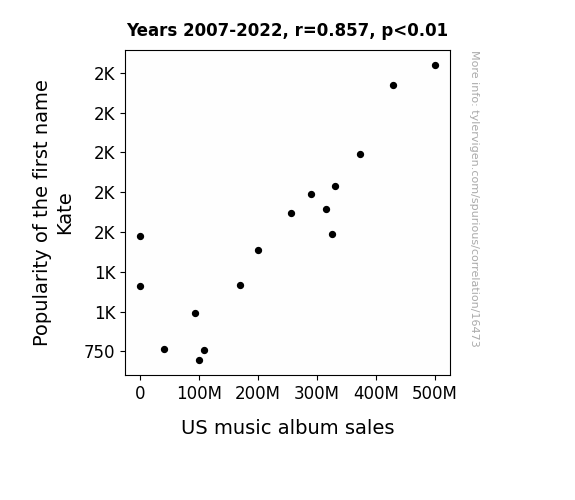 This means 73.5% of the change in the one variable (i.e., US music album sales) is predictable based on the change in the other (i.e., Popularity of the first name Kate) over the 16 years from 2007 through 2022.