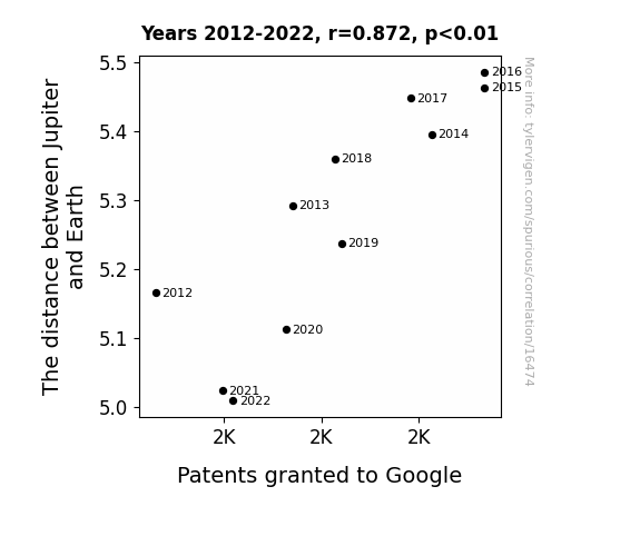 This means 76.1% of the change in the one variable (i.e., Patents granted to Google) is predictable based on the change in the other (i.e., The distance between Jupiter and Earth) over the 11 years from 2012 through 2022.