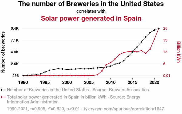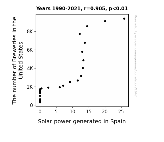 This means 82% of the change in the one variable (i.e., Solar power generated in Spain) is predictable based on the change in the other (i.e., The number of Breweries in the United States) over the 32 years from 1990 through 2021.