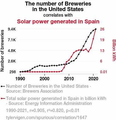 Your research team used data from Brewers Association and Energy Information Administration to assess this nagging question. You found a correlation coefficient of 0.9054089 and p < 0.01 for 1990 to 2021.