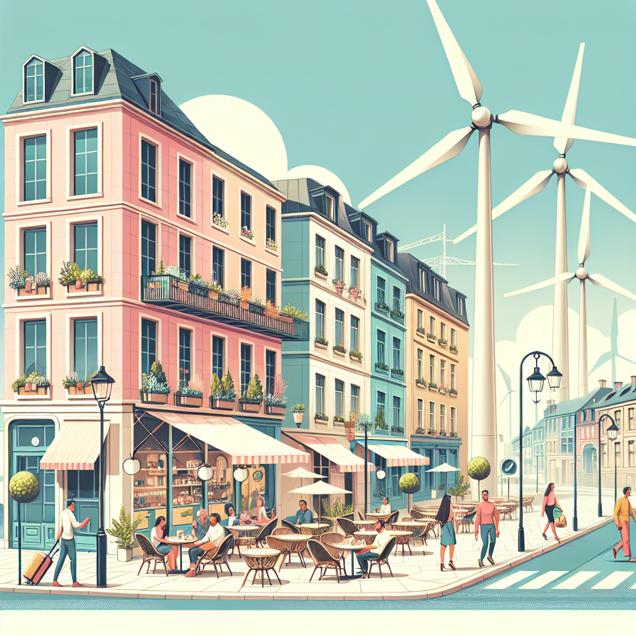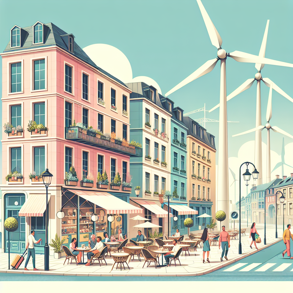 Prompt: Generate an image that showcases the endearing streets of Luxembourg, with vibrant pastel-colored buildings lining the roads. In the background, elegant wind turbines gracefully spin in the gentle breeze, highlighting a sustainable energy concept. Within the scene, include a cozy café with cute outdoor seating and people leisurely sipping coffee, working on laptops, and chatting on their smartphones, creating a lively and modern ambiance. The depiction should include only scenes, people, and objects, it should not include text or speech bubbles.