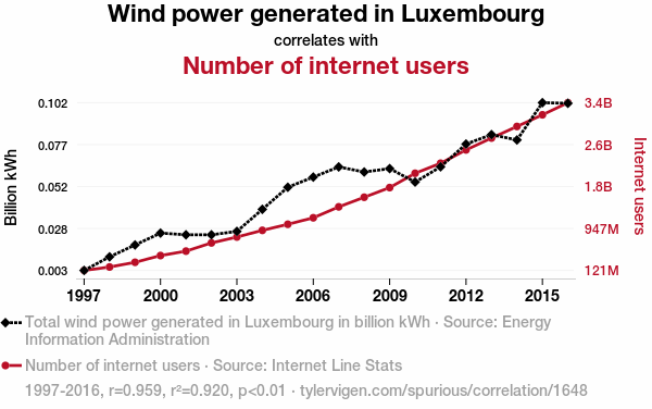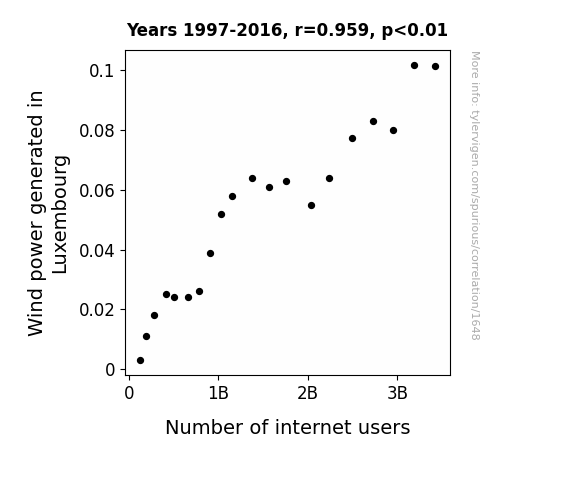 This means 92% of the change in the one variable (i.e., Number of internet users) is predictable based on the change in the other (i.e., Wind power generated in Luxembourg) over the 20 years from 1997 through 2016.