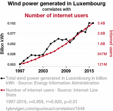 no direct connection between these variables, despite what the AI says above. This is exacerbated by the fact that I used "Years" as the base variable. Lots of things happen in a year that are not related to each other! Most studies would use something like "one person" in stead of "one year" to be the "thing" studied. - Observations not independent: For many variables, sequential years are not independent of each other. If a population of people is continuously doing something every day, there is no reason to think they would suddenly change how they are doing that thing on January 1. A simple
