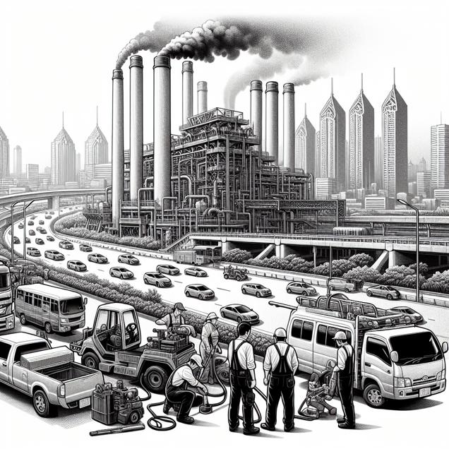ChatGPT: Generate a detailed black-and-white newspaper illustration of a vibrant cityscape in Thailand, with a towering biomass power plant emitting steam from its smokestacks. In front of the plant, depict a line of Volkswagen vehicles, with technicians from Volkswagen Group of America working diligently to address a recall issue. Emphasize the commitment to sustainability and environmental responsibility through the imagery of the bustling city and the symbiotic relationship between the power plant and the efforts of the technicians.