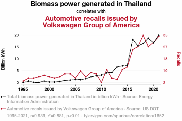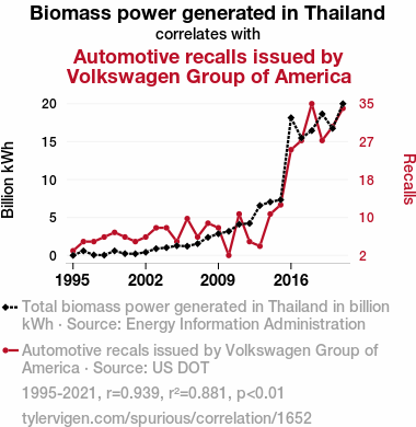This means 88.1% of the change in the one variable (i.e., Automotive recalls issued by Volkswagen Group of America) is predictable based on the change in the other (i.e., Biomass power generated in Thailand) over the 27 years from 1995 through 2021.
