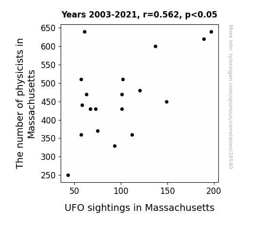 This means 31.5% of the change in the one variable (i.e., UFO sightings in Massachusetts) is predictable based on the change in the other (i.e., The number of physicists in Massachusetts) over the 19 years from 2003 through 2021.