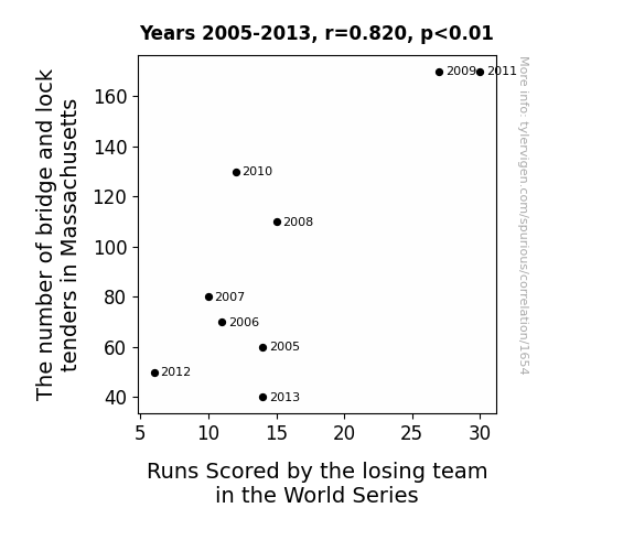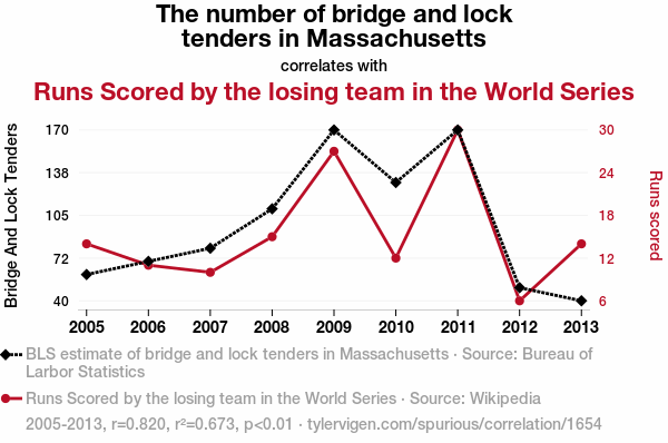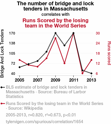 - The spurious research paper: Bridge the Gap: An Unlikely Correlation between Bridge and Lock Tenders in Massachusetts and Runs Scored by the Losing Team in the World Series