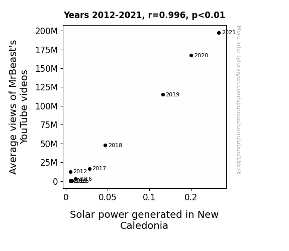 This means 99.3% of the change in the one variable (i.e., Solar power generated in New Caledonia) is predictable based on the change in the other (i.e., Average views of MrBeast's YouTube videos) over the 10 years from 2012 through 2021.
