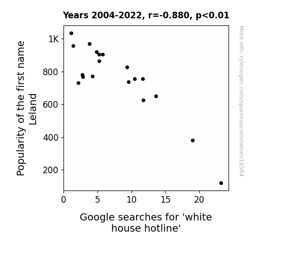 This means 77.5% of the change in the one variable (i.e., Google searches for 'white house hotline') is predictable based on the change in the other (i.e., Popularity of the first name Leland) over the 19 years from 2004 through 2022.