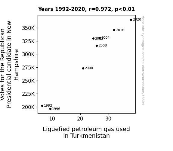 This means 94.4% of the change in the one variable (i.e., Liquefied petroleum gas used in Turkmenistan) is predictable based on the change in the other (i.e., Votes for the Republican Presidential candidate in New Hampshire) over the 8 years from 1992 through 2020.