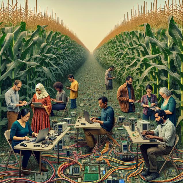 ChatGPT: In a vast cornfield in Illinois, rows of towering genetically modified corn plants stretch across the landscape. Amidst the green stalks, a team of skilled electronics engineers gather, their laptops and circuit boards laid out on makeshift workstations. They appear focused, surrounded by the rustling leaves of the GMO corn, combining their technical expertise with the agricultural innovation that thrives in the heart of the Midwest.