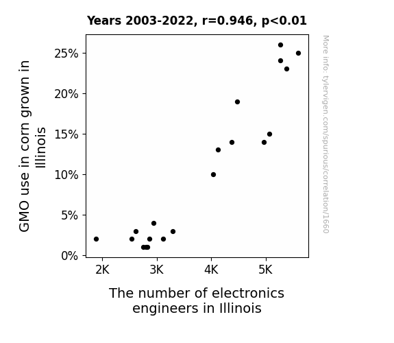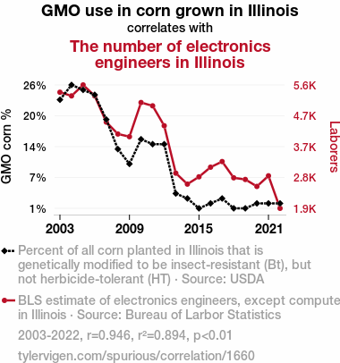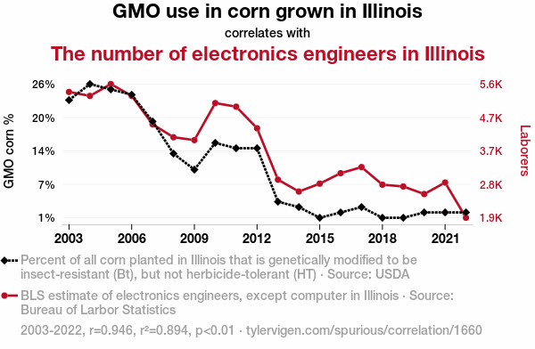 - The spurious research paper: Grain Gain: A Corny Correlation between GMO Usage and Electronics Engineers in Illinois